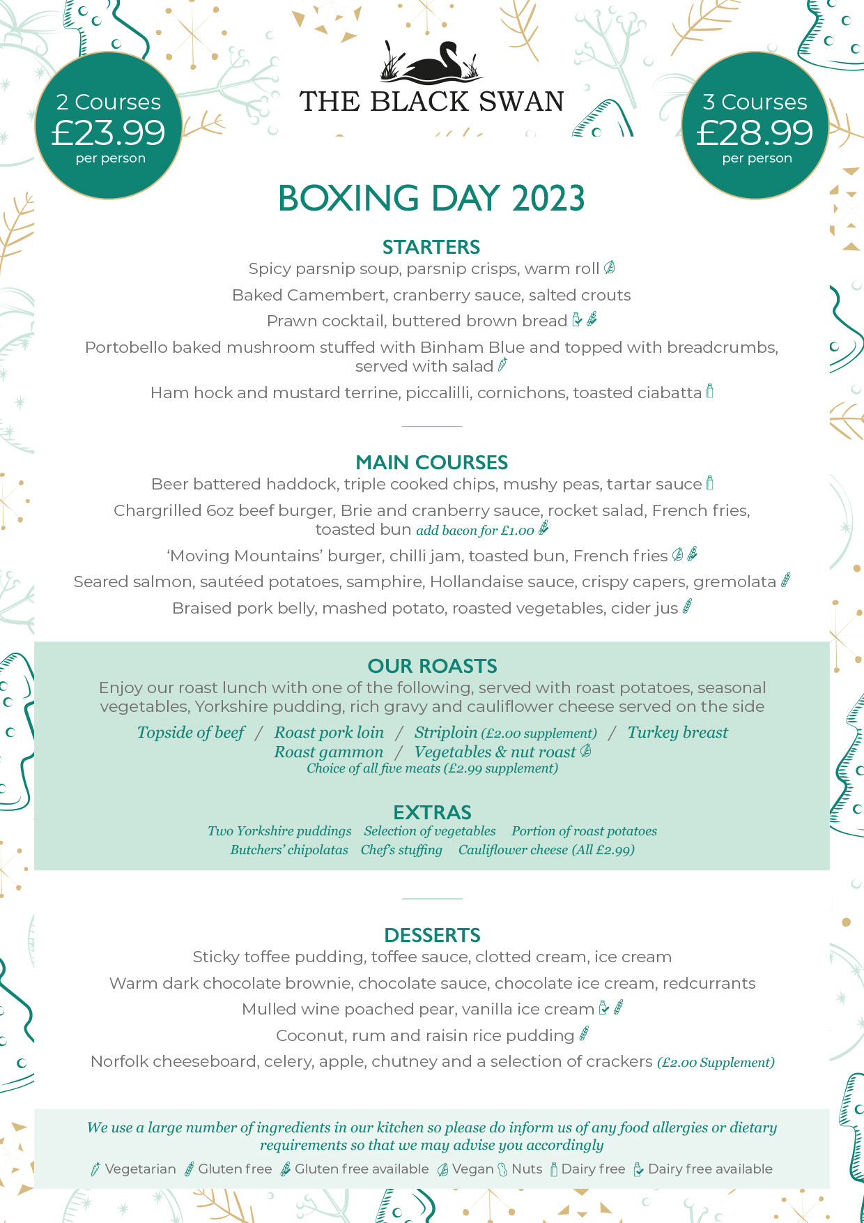 Please note: A £5.00 deposit is required for all bookings on Boxing Day. Pre-orders are required for bookings of 10 or more guests.