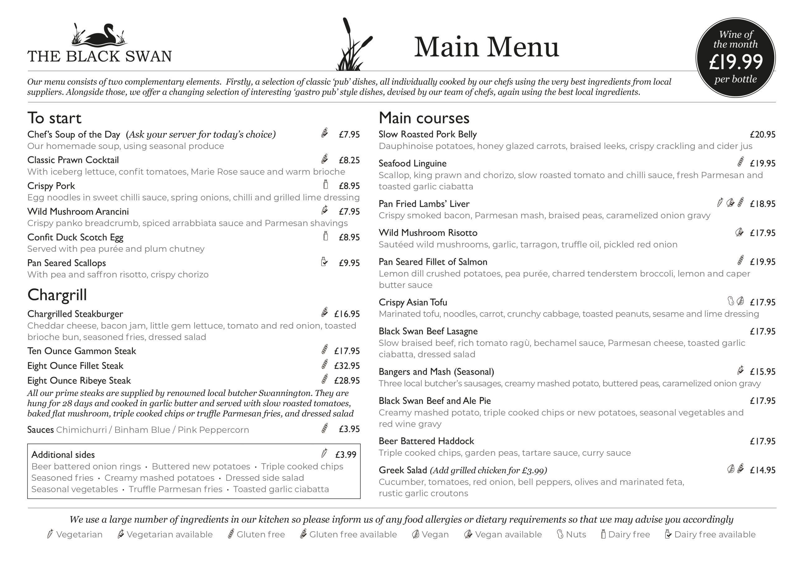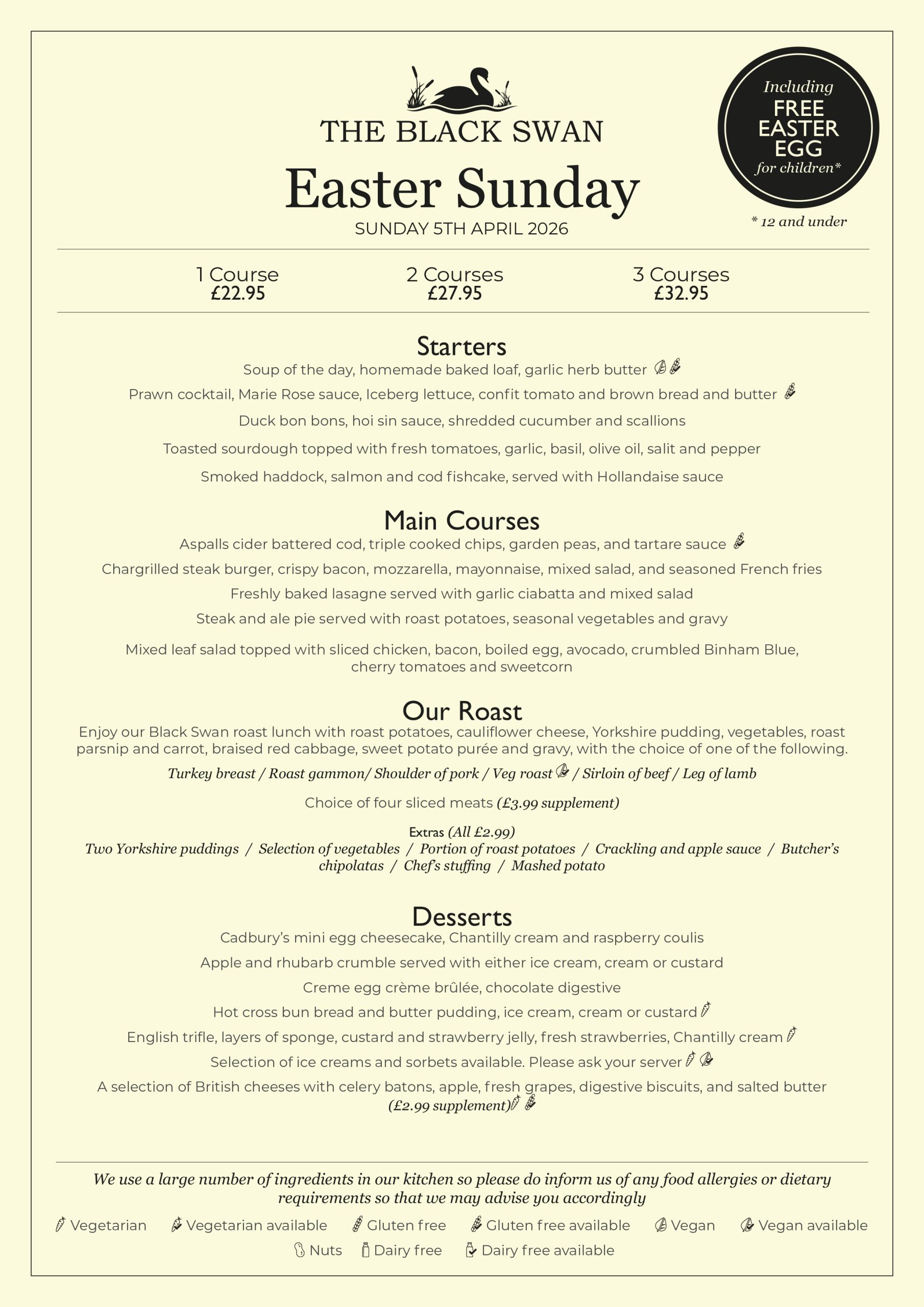 We have vegan dishes, along with our ‘cygnets’ menu for younger diners, and a full ‘a la Carte’ menu with daily specials. Our renowned roasts are served until 19:00 on a Sunday.